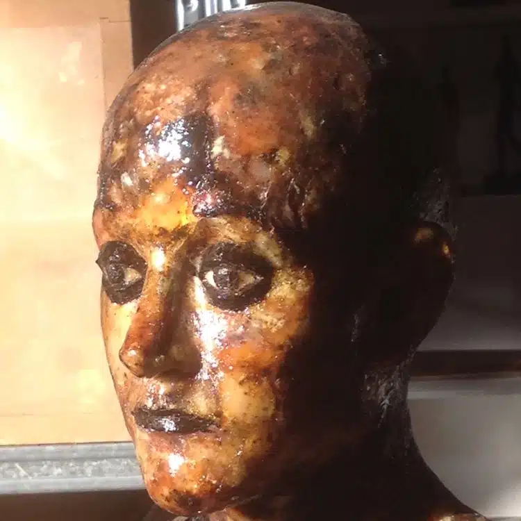 I’ve got an inkling of what he means. We’ve just visited his atelier in Pontives an alpine village strung out along the Val Gardena in the heart of the Italian Dolomites. From the windows of the vast circular structure, bright sun beams flood in and illuminate a host of hauntingly beautiful human figures, their surfaces chiselled, etched and burnt into an extraordinary array of patinas. My gaze is drawn to a figure of a slender woman whose torso and bald head is covered in luminescent rivulets of hardened resin.
